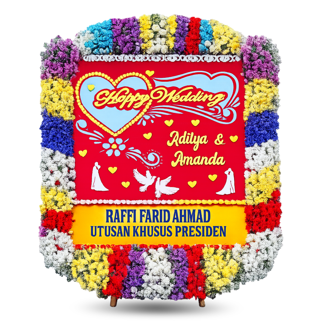 - Papan Bunga Pernikahan – Memberikan ucapan selamat kepada pasangan pengantin dengan rangkaian bunga yang elegan dan berwarna cerah.